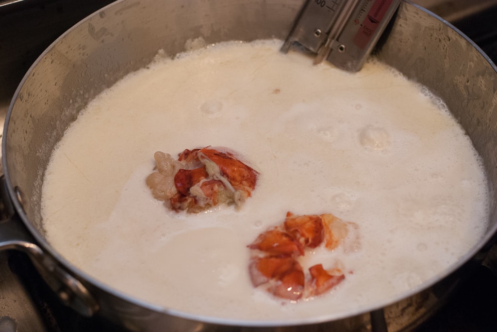 Once I had removed all the lobster from the shells and prepped the poaching liquid it was time to finish cooking the lobster.