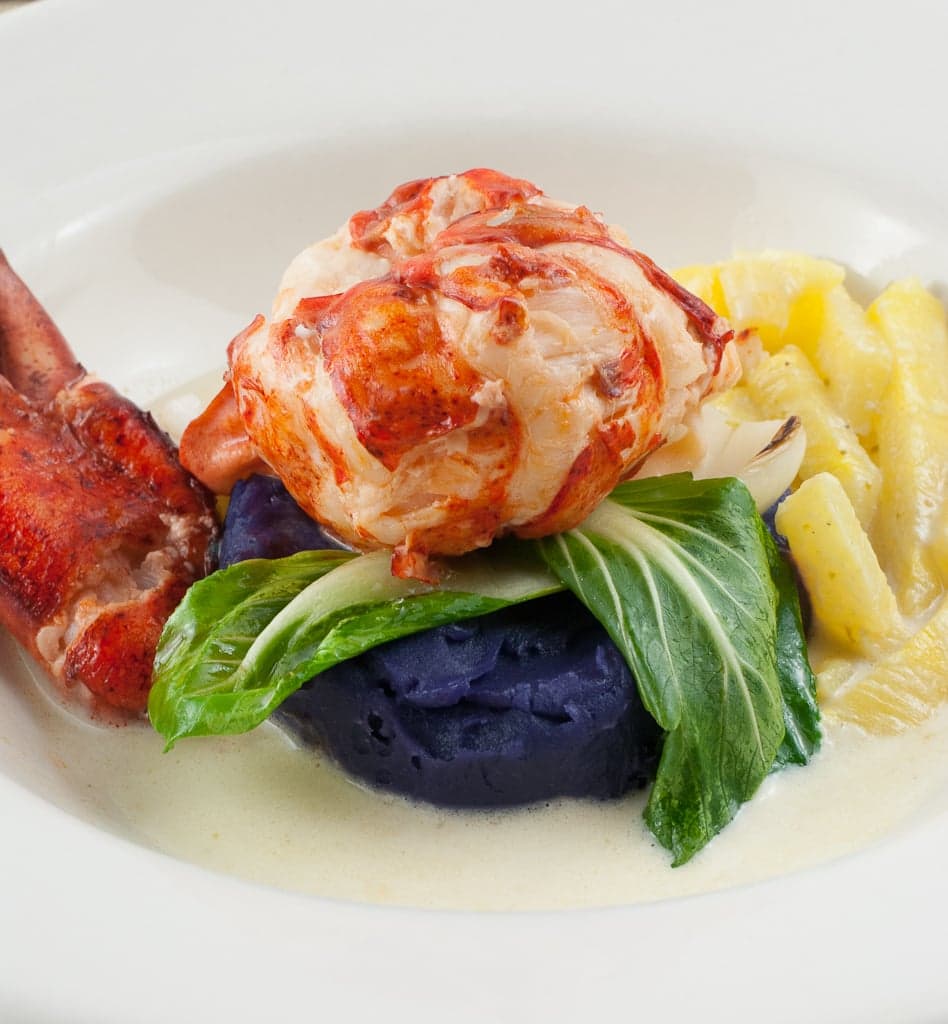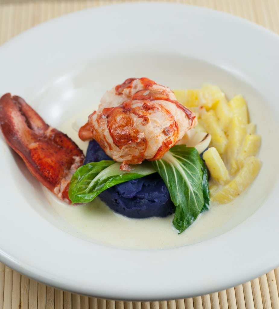 - Prepare your plate. Place about ¾ c of the purple sweet potato puree in the middle ( I used a biscut cutter to make the round shape, place baby bok choy leaves on top and then the lobster tail on top of that ( Remove the toothpick) Place the claw meat on one side and half of the leg and knuckle meat on the other . Spoon a few tablespoons of the curry sauce over the top of the lobster tail, and another 1-2 tablespoon of the sauce with the pineapple matchsticks over the leg and knuckle meat. Serve hot.
