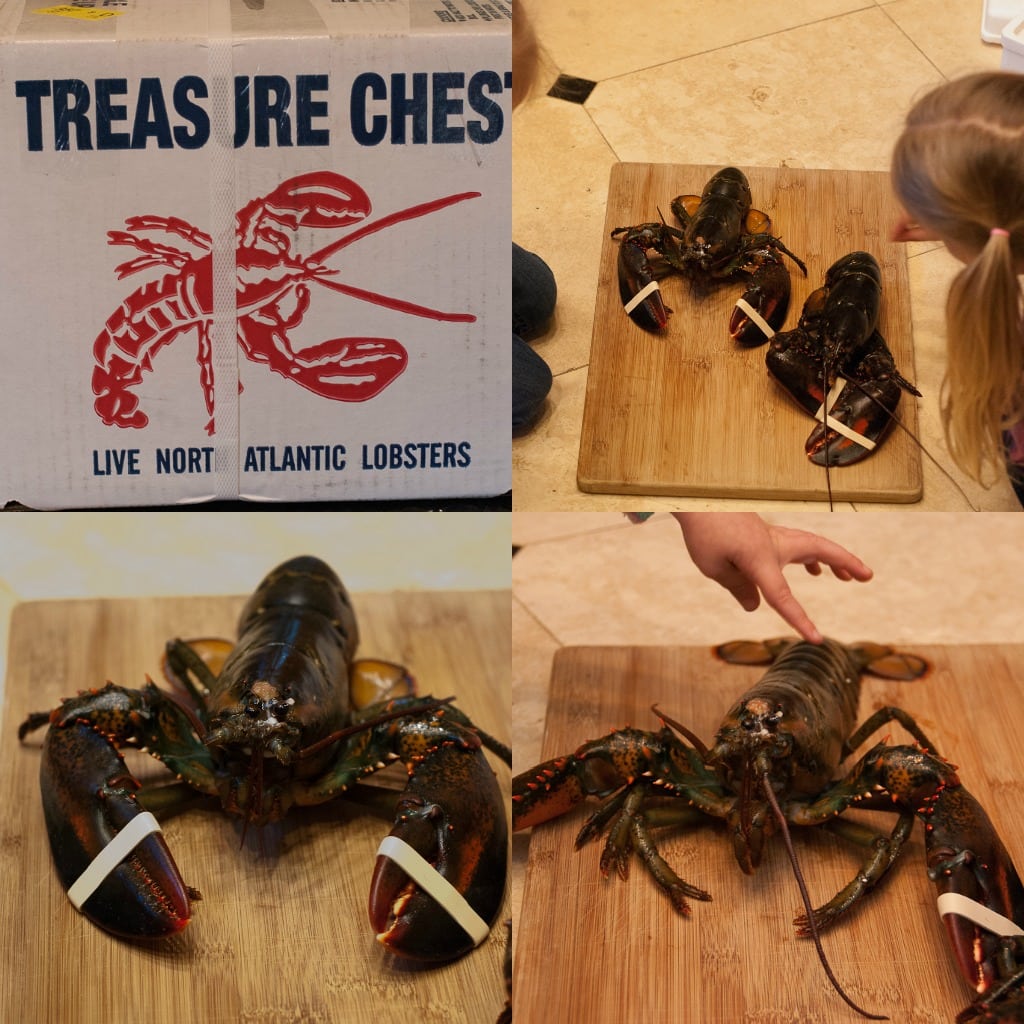 Best treasure chest ever. Two one and a half pound lobsters. My favorite bug. I told my kids that I had live bugs in the box and they wanted to see. My 4 year old " mom those aren't bugs those are lobsters!!" and proceeded to poke them, same with my 2 year old. We play with our food. One of the lobsters was more chill, no pun intended since they arrived packed on ice to keep them alive, and the other was quite feisty.