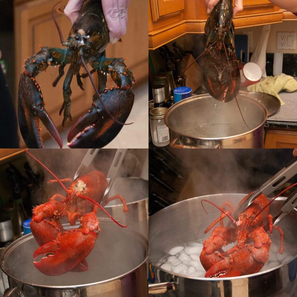 - Prepare the lobsters. In a large stock pot, bring water to a boil, place lobsters one at a time head first into the water and poach for 4 minutes. Immediately remove and place into another large pot filled with ice water. Let rest in ice bath for 20 minutes. Repeat with other lobster. The lobsters can sit in ice bath in same pot if your pot has enough room. After 20 minutes take lobsters out of pot, drain out excess water and set on a cutting board