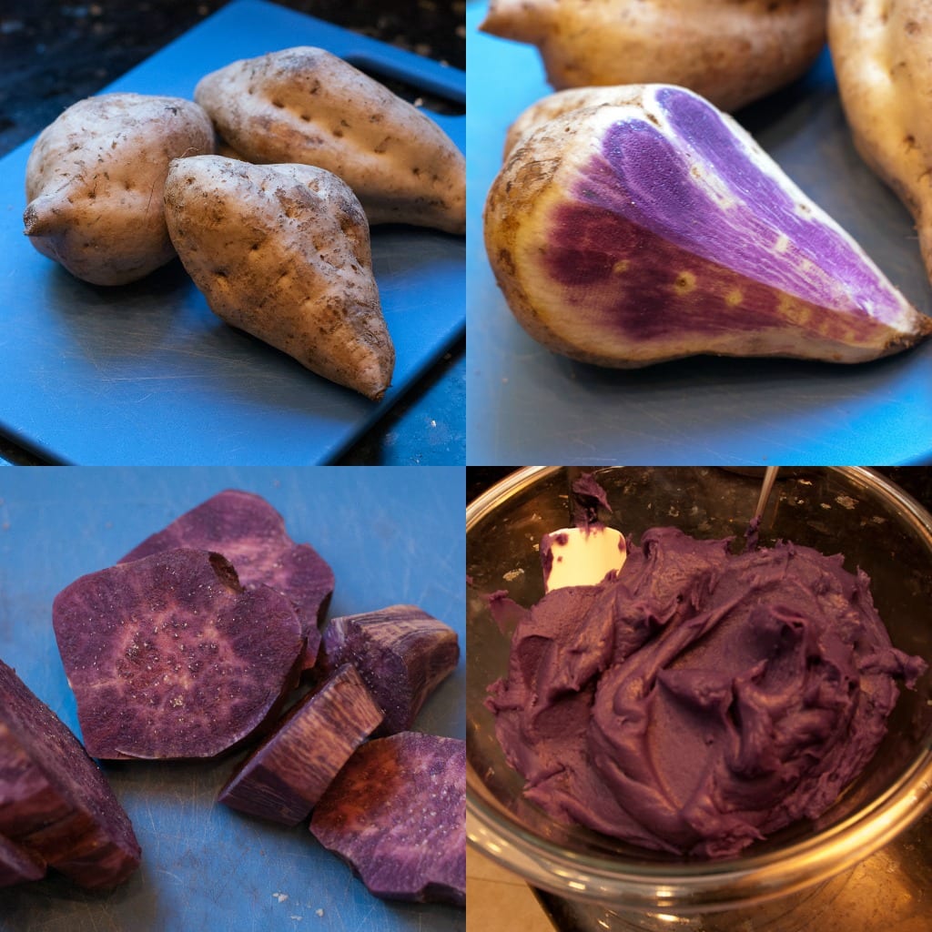 A little break from the lobstah and on to my most favorite potato of all, the purple sweet potato. Also called Ube, Okinawan sweet potato, Hawaiian sweet potato. LOVE these. I have only ever had them at luau's and in Hawaii. I found a market that sold them in Oregon when we used to live there and would stock up whenever I could. They have AMAZING flavor. They are starchier than normal sweets and take a little longer to cook, but their flavor is amazing and I add in coconut milk to make them creamier.