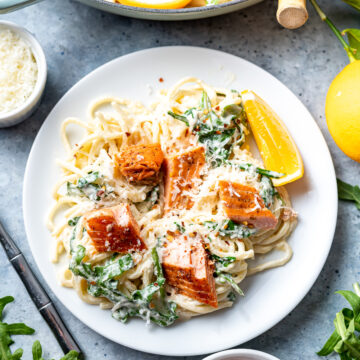I love simple dinners that pack a ton of flavor like this salmon pasta. And this recipe is made with a few simple ingredients, so there is less prep time to get dinner on the table fast. Which definitely helps for busy weeknights. Both of my daughters have loved salmon since they were very young, which I am very grateful for. Salmon is so healthy and good for you. My older daughter calls it "big brain food".