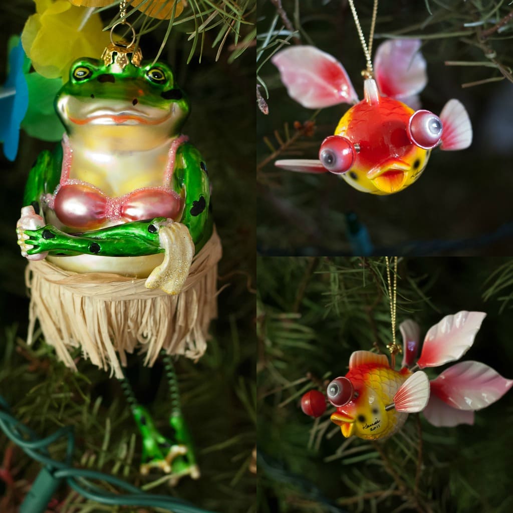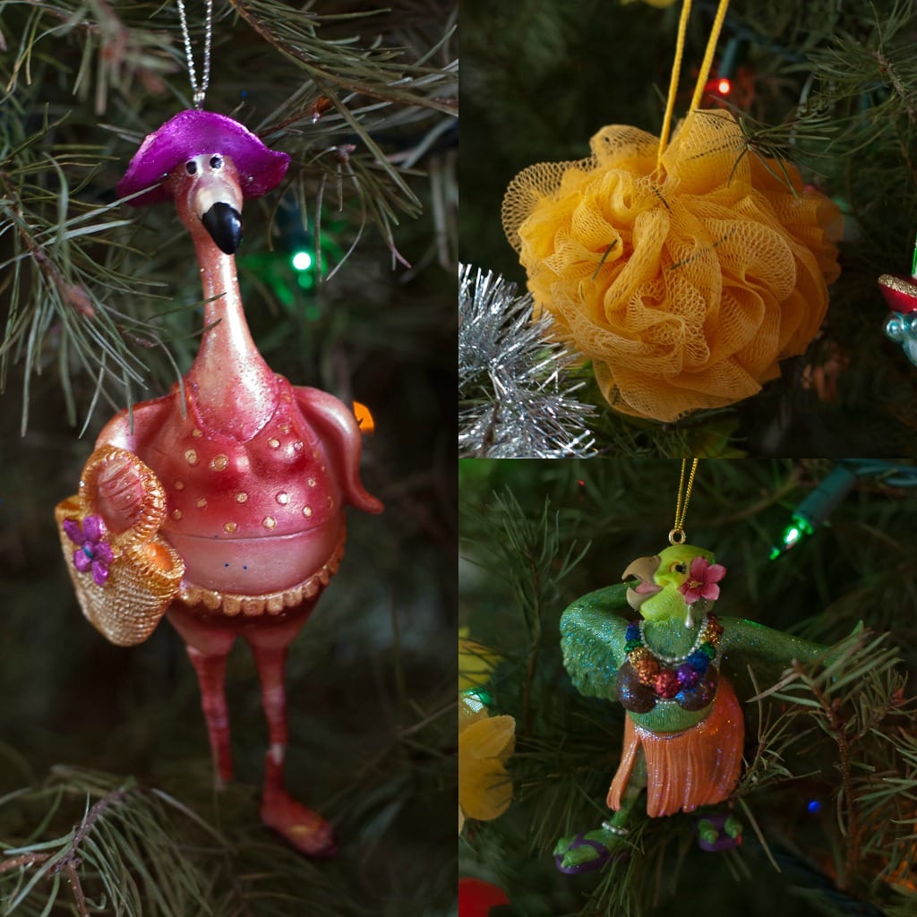 Yes the flamingo is missing a foot. And has boobs. Really no words for the parrot. And yes that is a loofa. That's more of a joke from my husband's and mine bizarre love for the movie Bad Santa and there is a scene about a loofa and for some reason I had an extra loofa so on the tree it went.