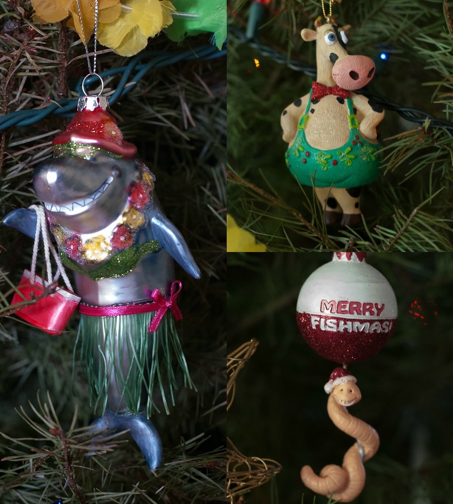 So this got me thinking about my family's more unusual ornament tradition. See, it started with my mom and her brother and dad when they were kids. They would try to find the UGLIEST ornament they could, wrap it in a box so no one would expect that gift to be the "ugly" and watch the reaction of the recipient and die with laughter over it. My mom has stories of making resin angel face ornaments and each one weighed like 5lbs and couldn't be broken, an Elvis one that my grandpa tried with all his might to break but couldn't. He couldn't stand Elvis. Sorry Elvis fans. And then the tradition continued on with us as kids and my mom started giving me an " ugly". It was always so much fun to try to guess which gift it was wrapped it. Fast forward to now and we still exchange them. I think someone is on to us though because each year I find at least a good dozen to choose from that are all equally ugly. I always ask the cashier if they think the ornament is ugly and they usually laugh and say " I think its kind of cute" to which my reply is almost always. " damn. I'm going for ugly not cute" then I have to explain why and the cashier ends up laughing hysterically or helps me try to find an even uglier one. My mom has collected so many uglies over the years that she has an " ugly tree" she puts up at Christmas. Its a fake tree, with a strand of red lights, and her collection of ridiculous ornaments, most are from me. I gave her this one a few years back. She didn't think she would ever be able to top it. I actually didn't think it was ugly, but hysterical and pretty outrageous.