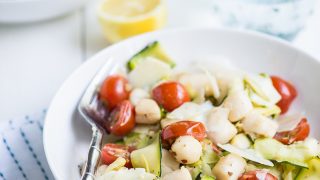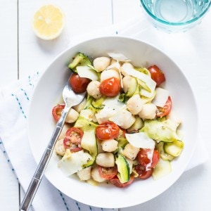 Warm bay scallop salad with zucchini, asparagus and a lemon shallot vinaigrette. A quick to make salad using a just few ingredients for a light and delicious meal.