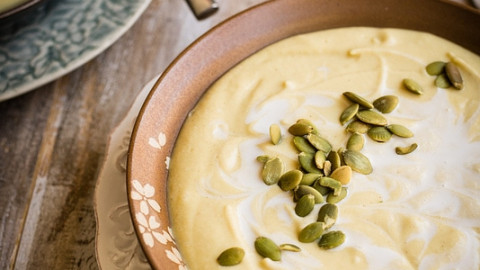 - Remove the peel from the roasted squash and place in the blender. Add in the remaining ingredients. Turn blender on and slowly raise the speed to 10 and then high. Blend for 5 minutes checking for steam by removing the vent cap on the lid. Stop the blender and taste and season with more spices if desired. Blend a few more minutes on high if needed for soup to be hotter. Serve and garnish with a drizzle of coconut milk and toasted pumpkin seeds