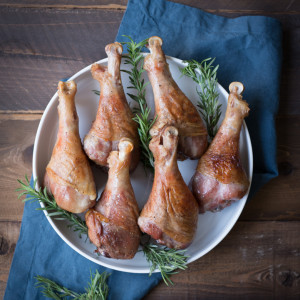 • In a medium pot combine the maple syrup, salt, orange peel, onion, rosemary, peppercorns, bay leaves and one quart of the water and heat until the salt is dissolved, stirring once in a while, but don’t bring to a boil. Once the salt is dissolved turn off the heat and let cool ten minutes. Add in the bourbon and the remaining water. Let cool completely. Place the turkey legs into a resealable gallon sized bag and pour the brine into the bag. Seal and let brine a minimum of 4 hours up to 24 hours. Preferably 12-14 hours for best flavor.