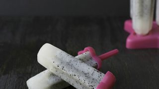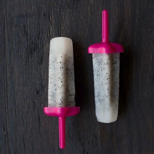 Both of the dragon fruit I received from Frieda's were white inside. They have a very mild not too sweet flavor, reminds me of a cross between honeydew melon and kiwi but the texture is a little more firm. I was thinking of making a cocktail with them but since I had made one with the Rambutans I decided popsicles.
