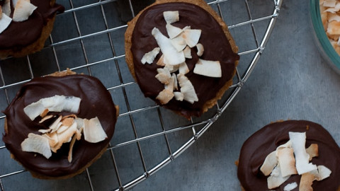 - Place the enjoy life chocolate chips in a glass or stainless steel bowl. In a saucepan over medium heat, heat the coconut milk to a simmer. Pour over the chocolate chips but don’t stir for a 5 minutes. After 5 minutes gently stir until the mixture is fully combined until smooth, about 2-3 min. Let cool to room temperature and thickened. Either spoon some ganache on top of the cookies or dip the tops in. Sprinkle the tops with some of the toasted coconut immediately. Let cool completely to let the ganache firm up.