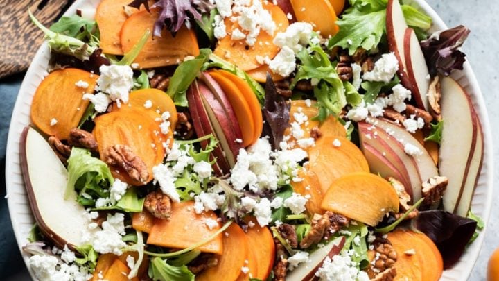 This pear persimmon salad is great for holidays as well for a quick to whip up salad full of flavor and seasonal produce. If you are looking for a last minute salad to make for Thanksgiving or Christmas, this is the salad to make.