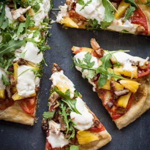 Grilled Pineapple and Pork Belly Pizza with Arugula and Burrata