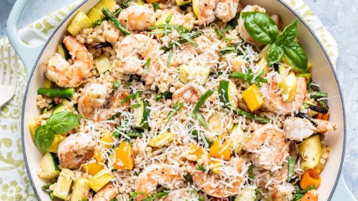 Pasta dishes have been very popular these past few months and Israeli couscous is one of my favorite pastas to cook. Israeli couscous is a pantry staple at our house and shrimp is a freezer staple. Both quick and easy to cook and you can season in so many ways for many different dishes.