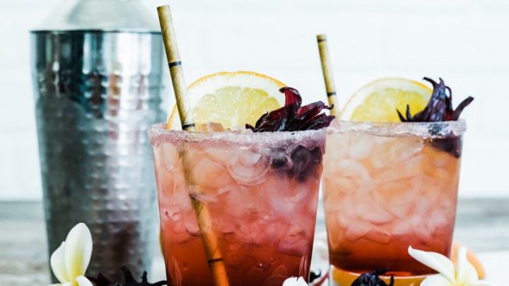 - 1. Pour a little of the hibiscus syrup into a bowl and sugar in another bowl. Dip the rim of your glass into the syrup, let excess drip off then dip into the sugar, making sure to coat the whole rim. Set glasses aside.