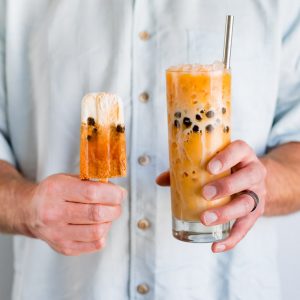 - If you want a uniform color mix the tea and sweetened condensed milk together, add one third a cup of the sweetened tea to each mold then add in a tablespoon of boba pearls to each. Freeze 45 min until slushy then add the popsicle sticks, cover with popsicle mold lid and freeze completely. Or you can add the coconut milk first and freeze as stated in the primary instructions, then add the Thai Tea mixture and add the boba before partially freezing, adding in sticks and then freezing completely. Really no wrong way to make these popsicles, all depends on the look you want them to have is how you mix up the liquid or freeze in layers.